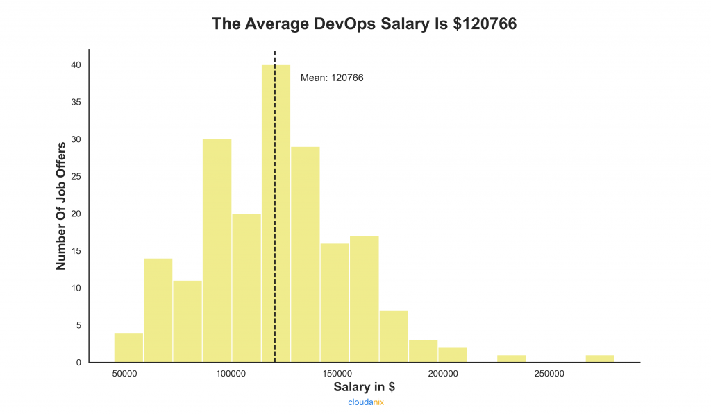 Using the above histogram, we can infer that the average salary offered to a DevOps professional in the US is $120,766 per year.