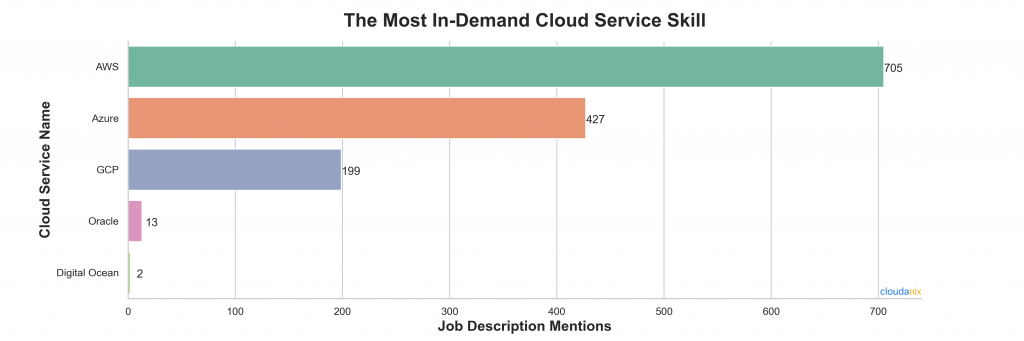 Knowing both AWS and Azure seems to be the way ahead as 154 job postings have recruiters searching for a candidate skilled in AWS and Microsoft Azure. The analysis also showed that 135 job postings needed knowledge of the three top cloud services – AWS, Azure, and Google Cloud Platform (GCP).